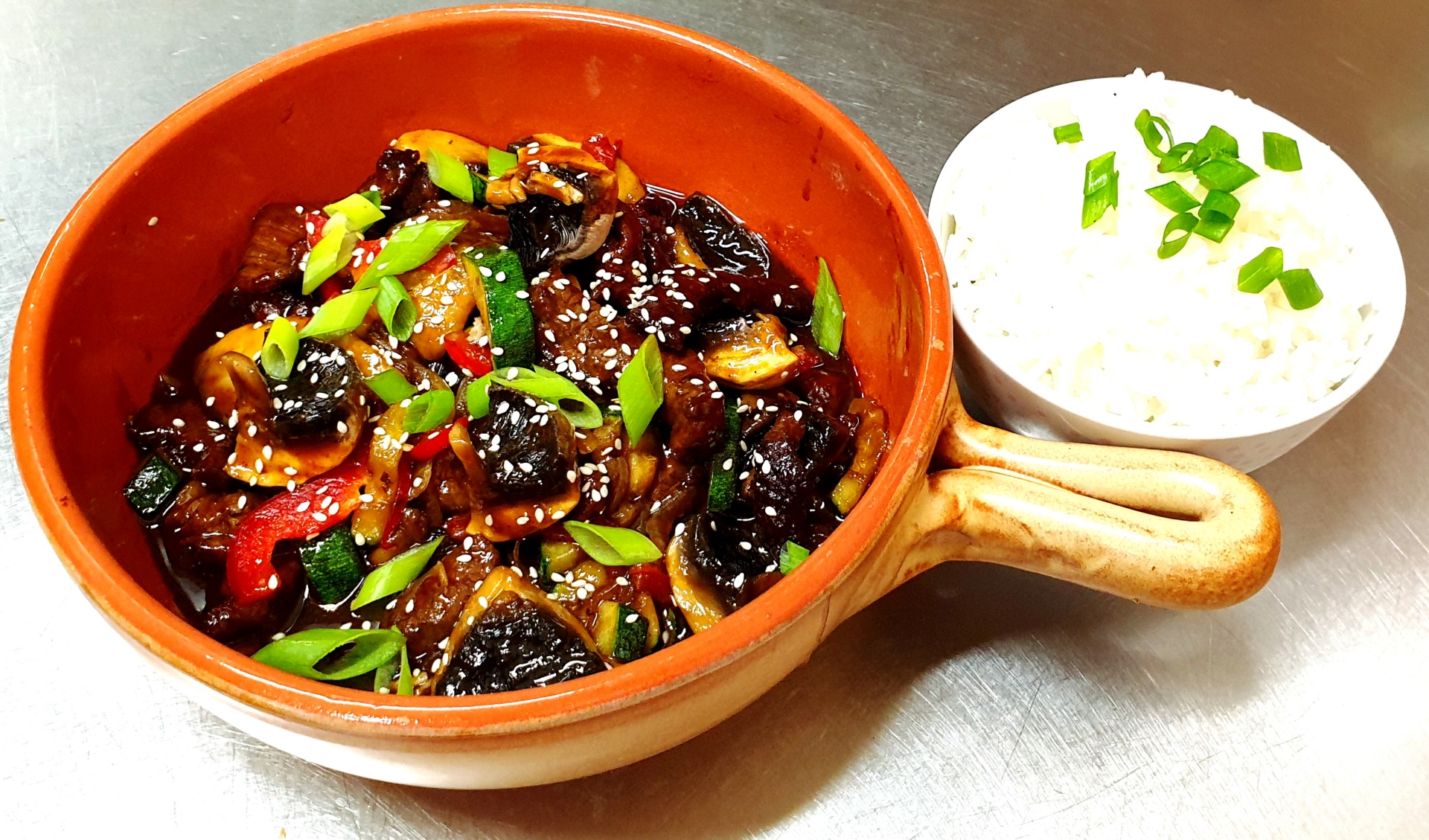A pan of cut Uruguay meat with chilli soyasauce and roasted vegetables, served with basmati rice